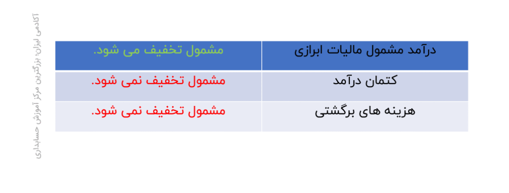 2- با توجه بهصراحت تبصره (6) ماده 105 قانون مالیاتهای مستقیم، درآمد مشمول مالیات ابرازی شرکتها و اتحادیههای تعاونی متعارف و شرکتهای تعاونی سهامی عام مشمول بیست و پنج درصد (% 25) تخفیف از نرخ موضوع ماده مذکور میباشد و درآمدهای کتمان شده، هزینههای برگشتی و سایر مواردی که بر اساس مقررات به درآمد مشمول مالیات ابرازی شرکت اضافه میشود مشمول تخفیف مذکور نبوده و به نرخ مقرر در ماده 105 قانون مالیاتهای مستقیم مشمول مالیات میباشد. در مواردی هم که درآمد شرکت و اتحادیه به روش علی الراس تعیین میگردد، درآمد مشمول مالیات ابرازی اشخاص مذکور، مشمول تخفیف یادشده خواهد بود.